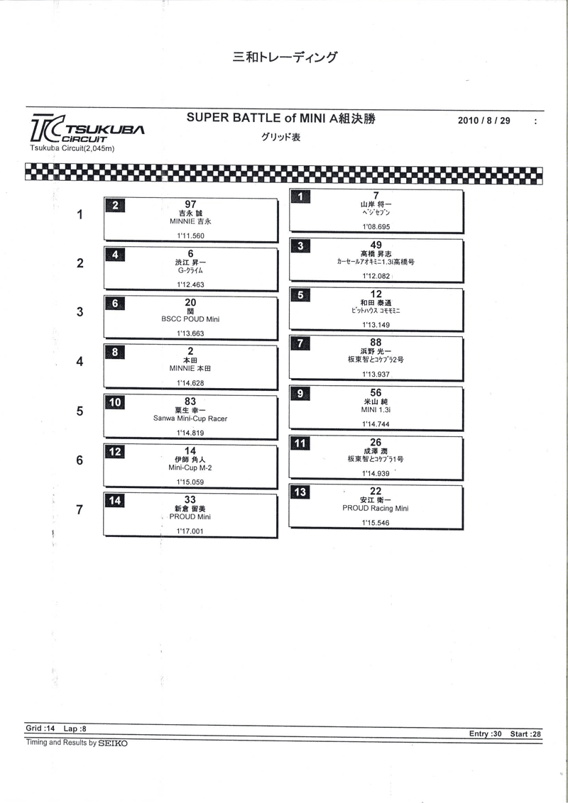 無事行われました。スポーツ走行会クラスの他、ローバーミニだけで争われる、SUPER BATTLE of MINIの第 2 戦、また、今回初めての試みとなる、スーパーセブン専有クラス SEVEN SUPER LAP BATTLE