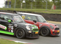 今年は異常気象で雨天が続くイギリス。イベント両日も時折日が差すものの小雨が降ったり止んだりとドライバーにとっては難しいコースコンディションにあったにちがいありません。レースでは、ミニセブンに29台、ミニミグリアに22台の、計51台のレーシングミニがダブルヘッダーに挑み、初日の予選から熱い戦いが繰り広げられました。ミニセブンでは、予想通り昨年の覇者マックス・ハンターとアンドリュー・デビーニーの接戦が繰り広げられ、初日の決勝ではデビーニーがハンターを抑え0.677秒の僅差で勝利。2日目は更に白熱した接近戦となり、ファイナルラップの最終コーナーまでサイド-バイ-サイドでお互い譲らず、観客総立ちの中、なんと0.078秒の僅差で今度はハンターが昨日の屈辱を晴らし見事勝利。今季4勝目を挙げトップのデビーニー追従の手を緩めません。ミニミグリアでは、シリーズ順調にポイントを重ねるケイン・アスチンとピーター・ボールドウィンに注目。アスチンの調子がいまひとつの中、絶好調だったのがアーロン・スミス。初日決勝では1秒に4台がフィニッシュする大混戦で0.062秒差でボールドウィンを抑えスミスが勝利。2日目もこの2人がバトルを展開。ボールドウィンはスミスを追い回すが、0.040秒届かずまたも2位。蓋を開ければ、2戦ともスミスのポールトゥーウィンの完全勝利となり、シリーズチャンピオン争いでアスチンとボールドウィンを猛追する。
